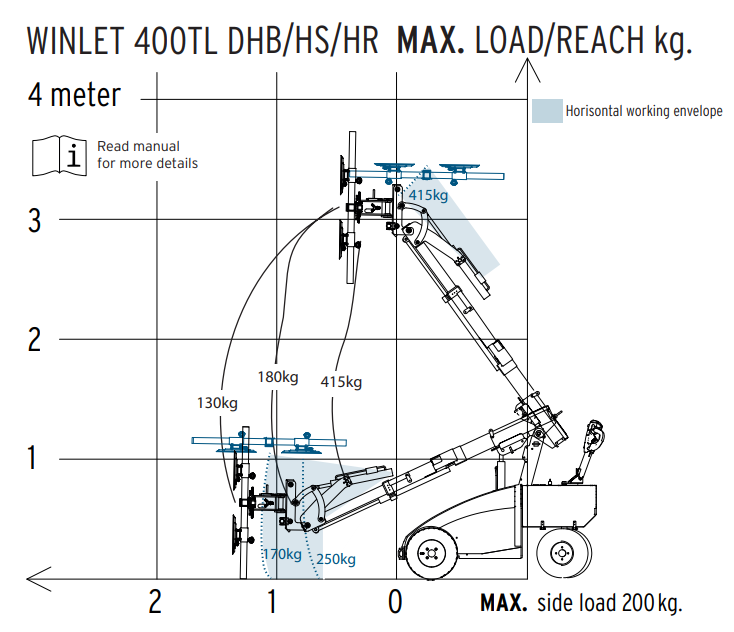 The Winlet 400 is one of the latest models. A maximum capacity of 415kg and the ability to lift loads over 3.5m directly overhead makes this a powerful glass installation machine. Yet it remains highly compact and manoeuvrable, making it easy to navigate around construction sites.